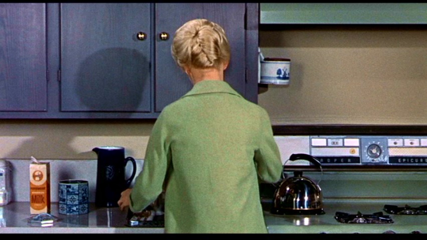 Melanie (Tippi Hedren) in Mitch's kitchen in Bodega Bay: