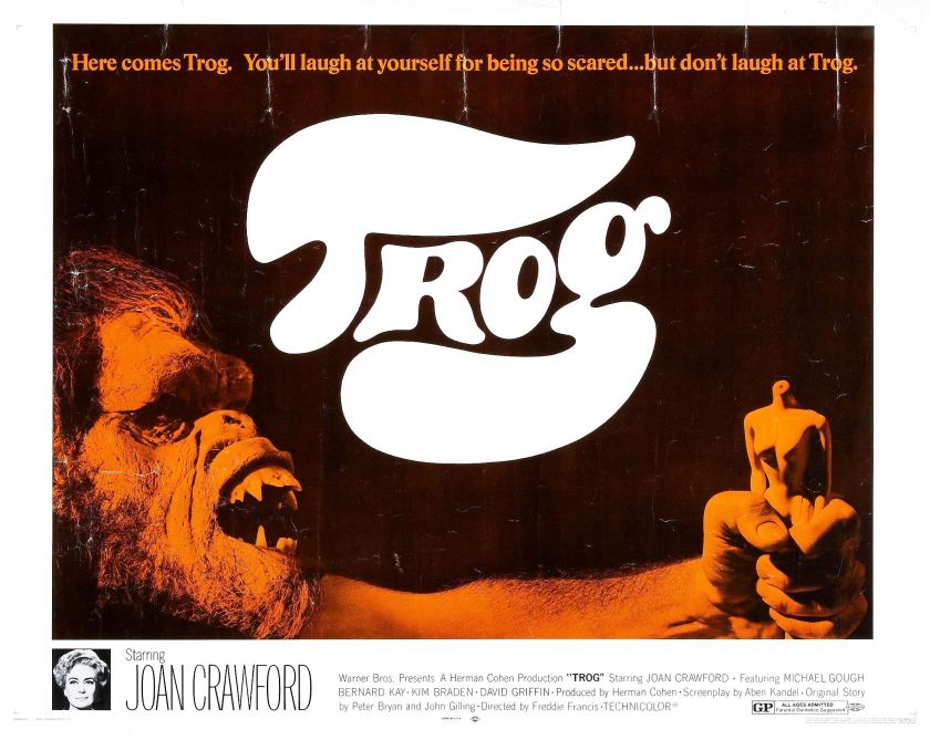 Oh, Trog. You lifted the fog off of these January blues (with the depressing chatter of the 2012 Republican primaries in the background). You are the funniest movie I've seen in a while. I love the way your title character (in a cheap mask and makeup) and Joan Crawford [in an incredible array of pantsuits and skirt suits (and surgery scrubs!) in all shapes, pastel colors, and fabrics] interact with one another. It was cute when Trog showed how a windup doll works. You got a bit boring in the courtroom scenes however I howled when Crawford compared Trog to a "retarded child." Your rubber dinosaur montage is ludicrous. When Trog goes on a rampage and scares schoolchildren in a sleepy English hamlet you spark to life. You're a camp classic. You give Joan's last moment in film a wistful, appropriately melancholy touch. Thank you Trog for existing in this gloomy world.